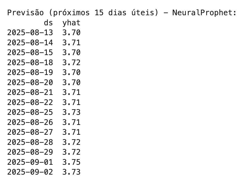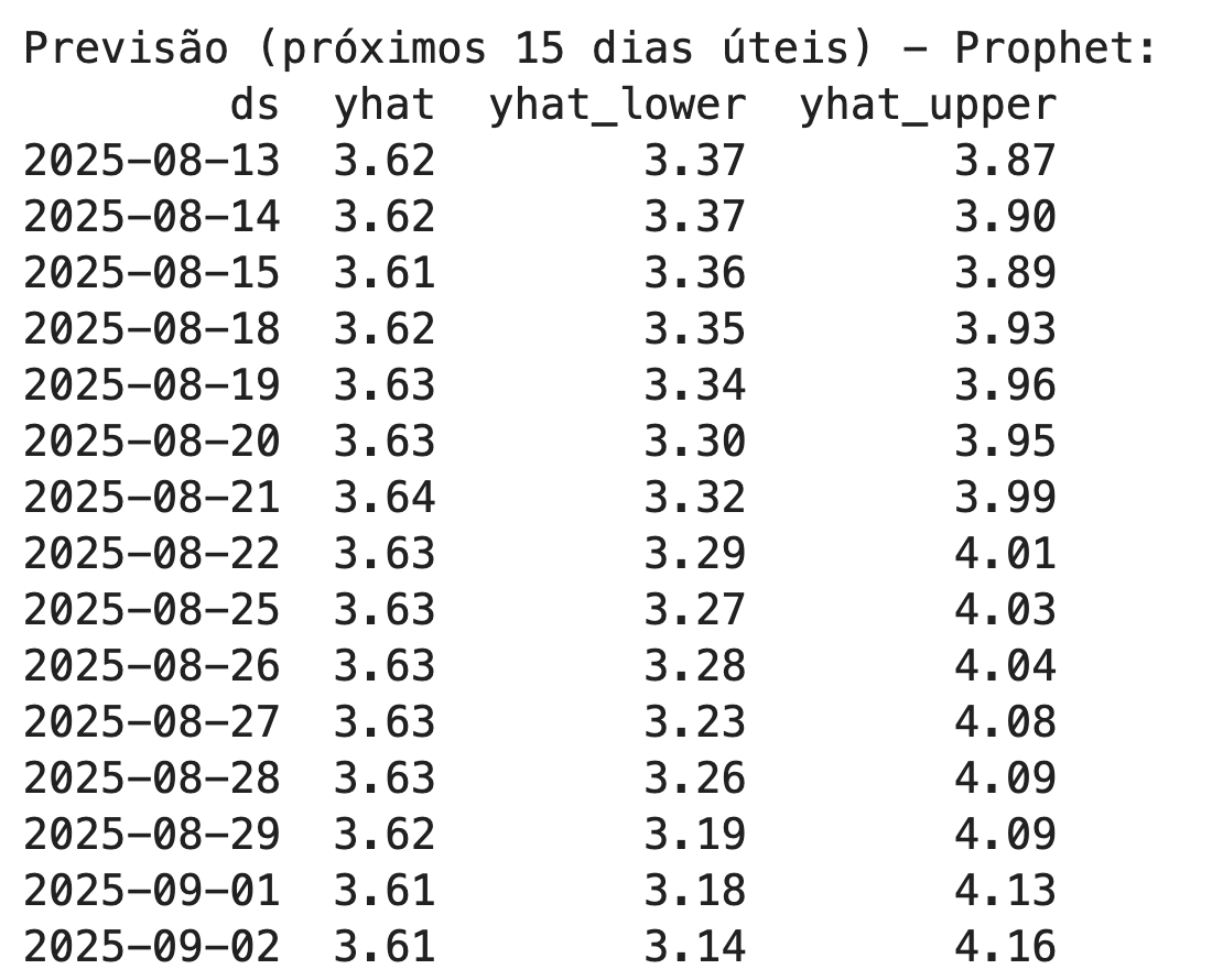 Repare que o algoritmo foi mais consistente nesse período que o LSTM. A coluna yhat indica o valor previsto, que ficou em torno de R$ 3,63 com um erro menor. No entanto apresenta uma incerteza muito grande nos resultados. Repare que quanto mais distante no futuro é a previsão, maior é margem de erro (yhat_lower, yhat_upper).