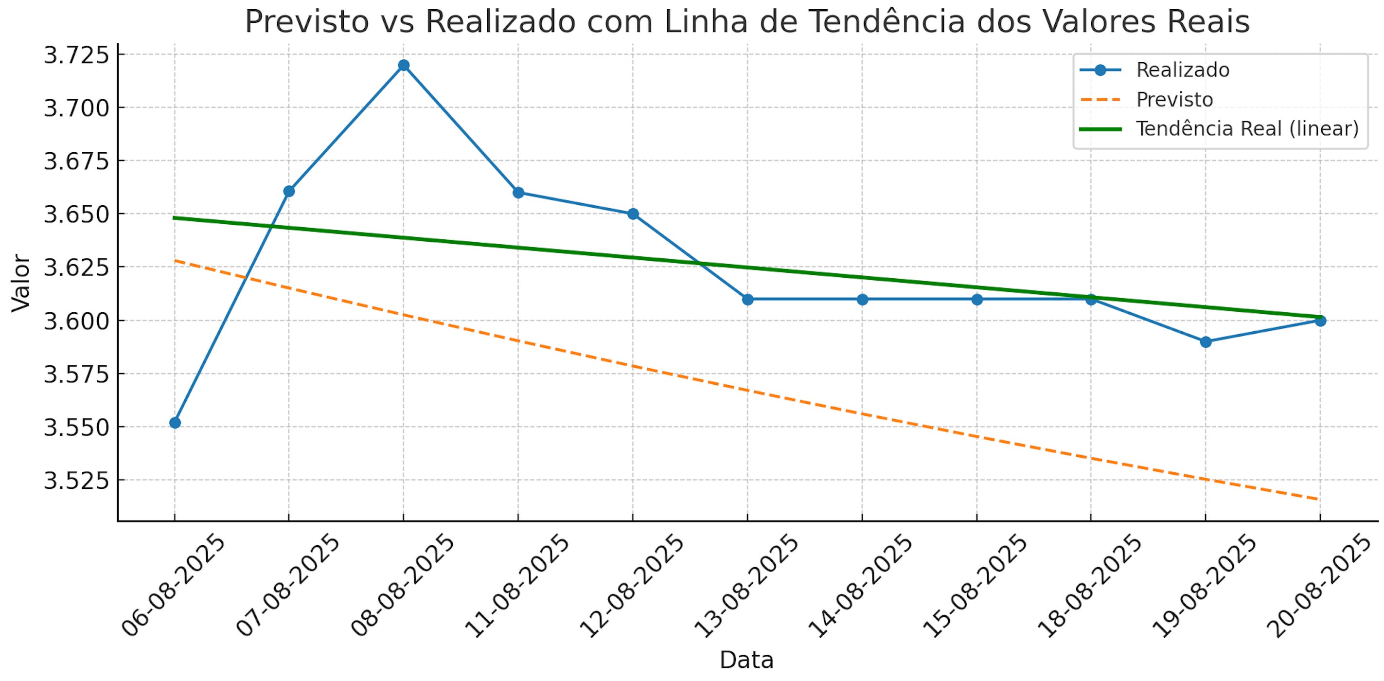 Coeficiente angular (-0.00466): indica uma leve queda diária nos valores reais ao longo do período.