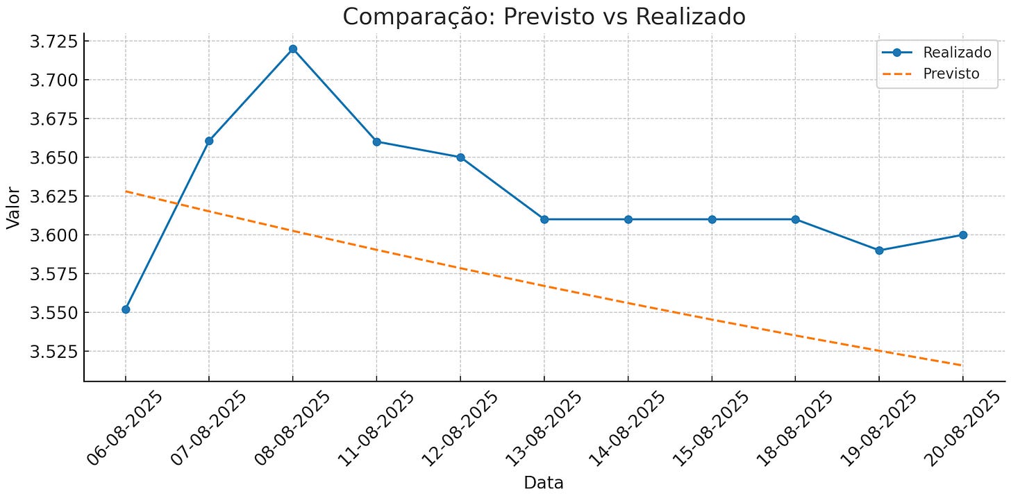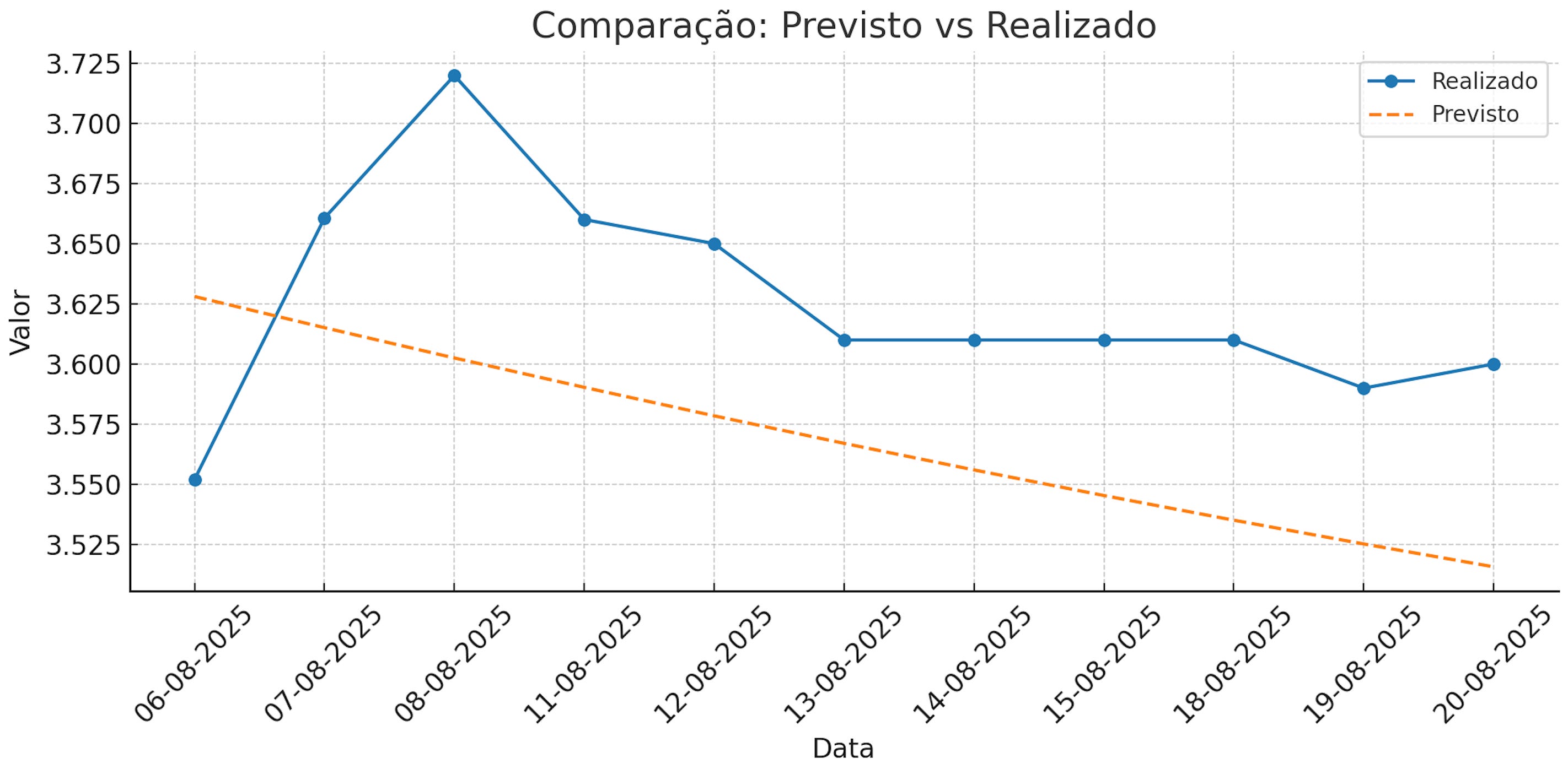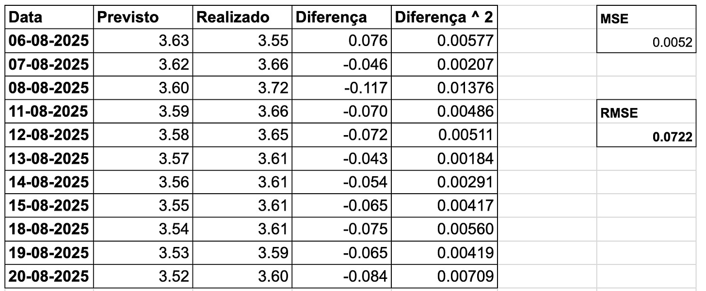 Neste artigo recapitulamos as previsões de 6 de Agosto até o dia 15 desse mesmo mês e comparamos com a realidade nesse período. Elas indicavam uma tendência de queda para R$ 3.51 até o dia 20/08: