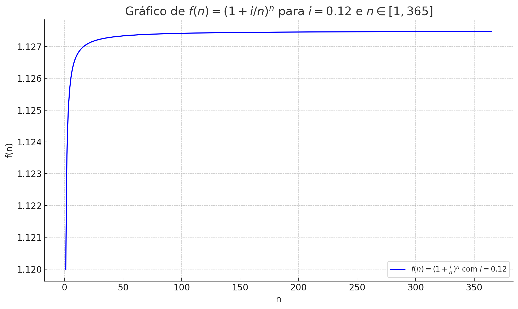 O limite desta função, quando o n tende ao infinito é o “número mágico”, o número de Euler elevado à taxa de juros:
